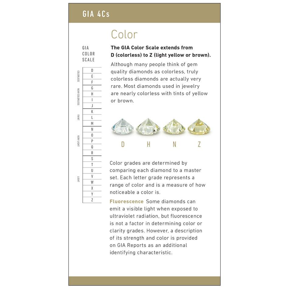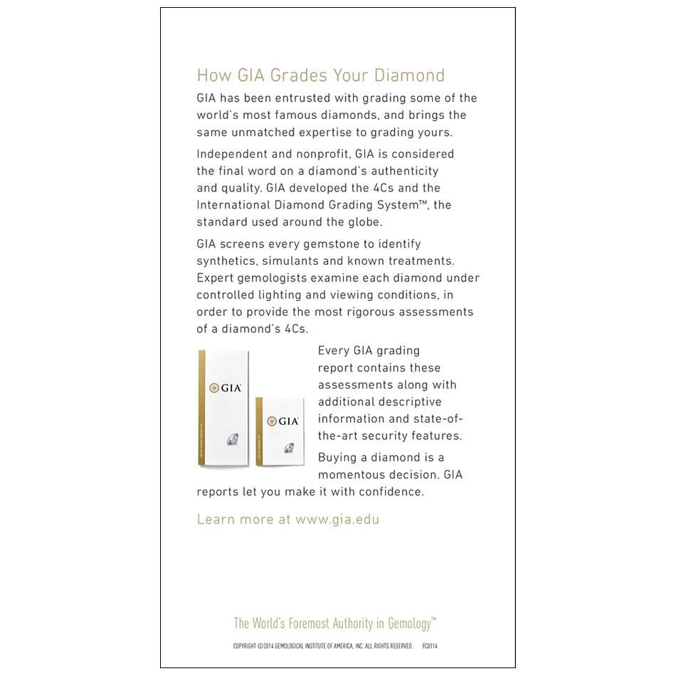 Available in 18 languages, GIA's 4Cs of Diamond Quality Brochure is designed to educate consumers about the 4Cs of diamond quality. In addition to underscoring the beauty and rarity of diamonds, this brochure depicts the GIA Color and Clarity scales, as well as the GIA Cut scale for round brilliants.