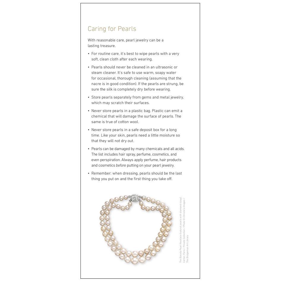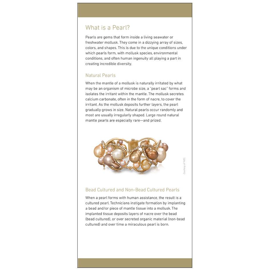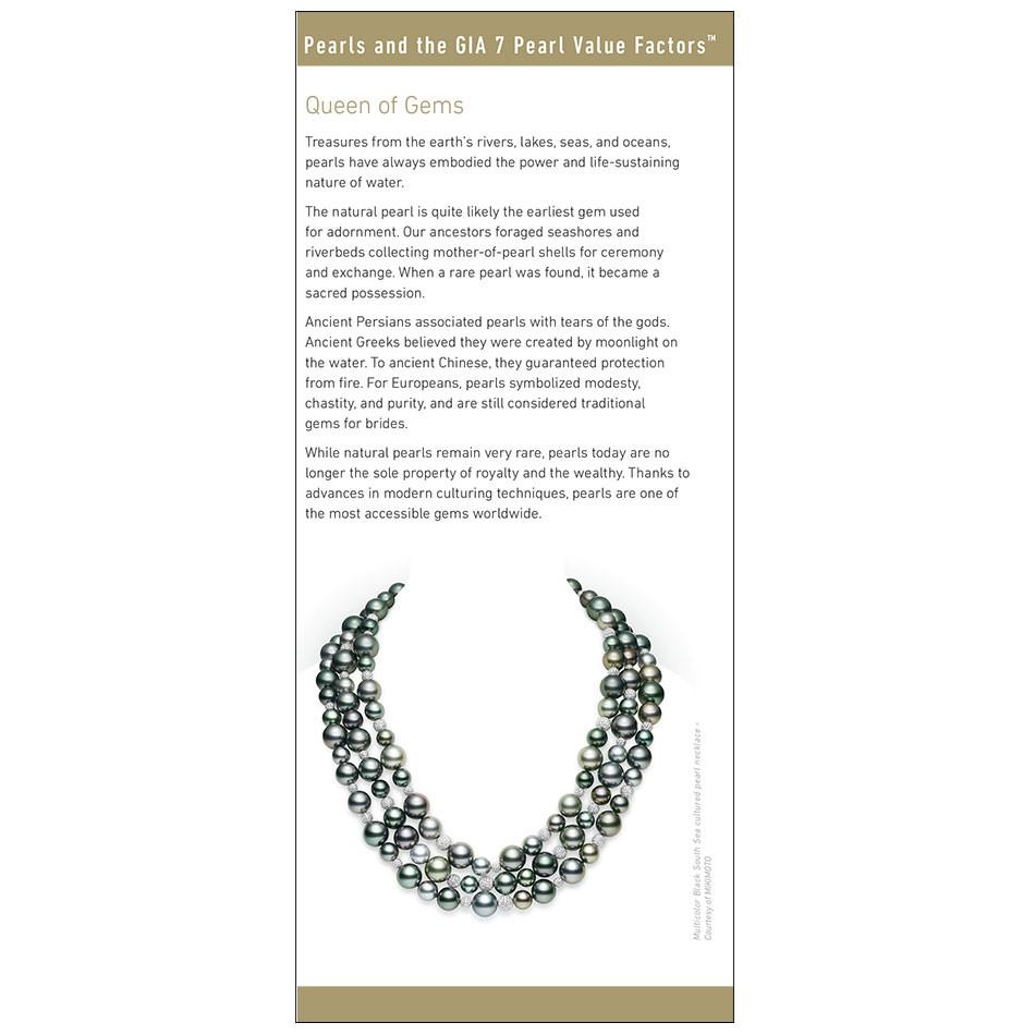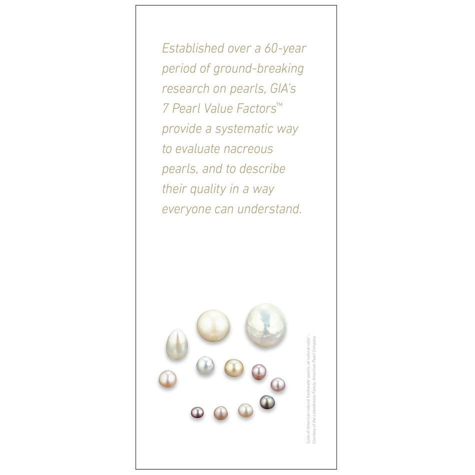 GIA's 7 Pearl Value Factors™ Brochure is designed to educate consumers about the determinate characteristics of pearl quality. In addition to underscoring the beauty of pearls, this brochure includes information on the different varieties of pearls as well as a detailed guide on pearl care.