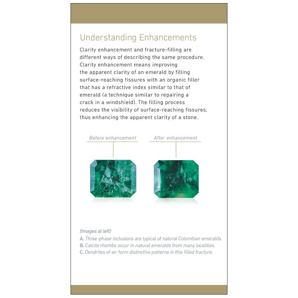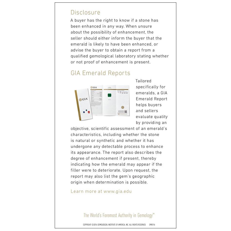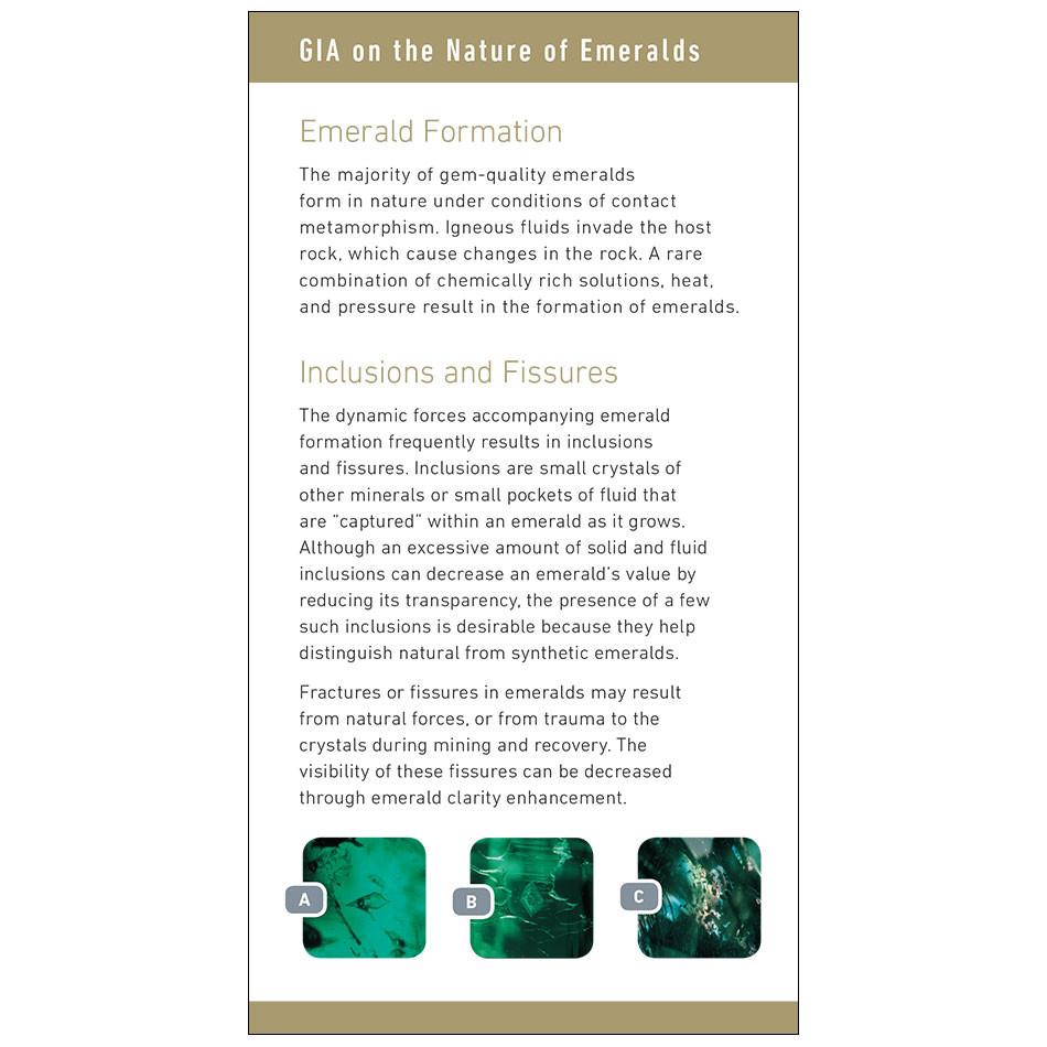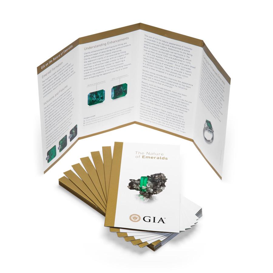 GIA's The Nature of Emeralds Brochure is designed to educate consumers about emeralds and their enhancements. In addition to underscoring the beauty of emeralds, this brochure includes information on the formation of emeralds as well as tips for caring for enhanced emeralds.