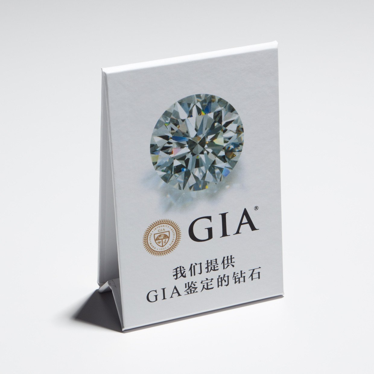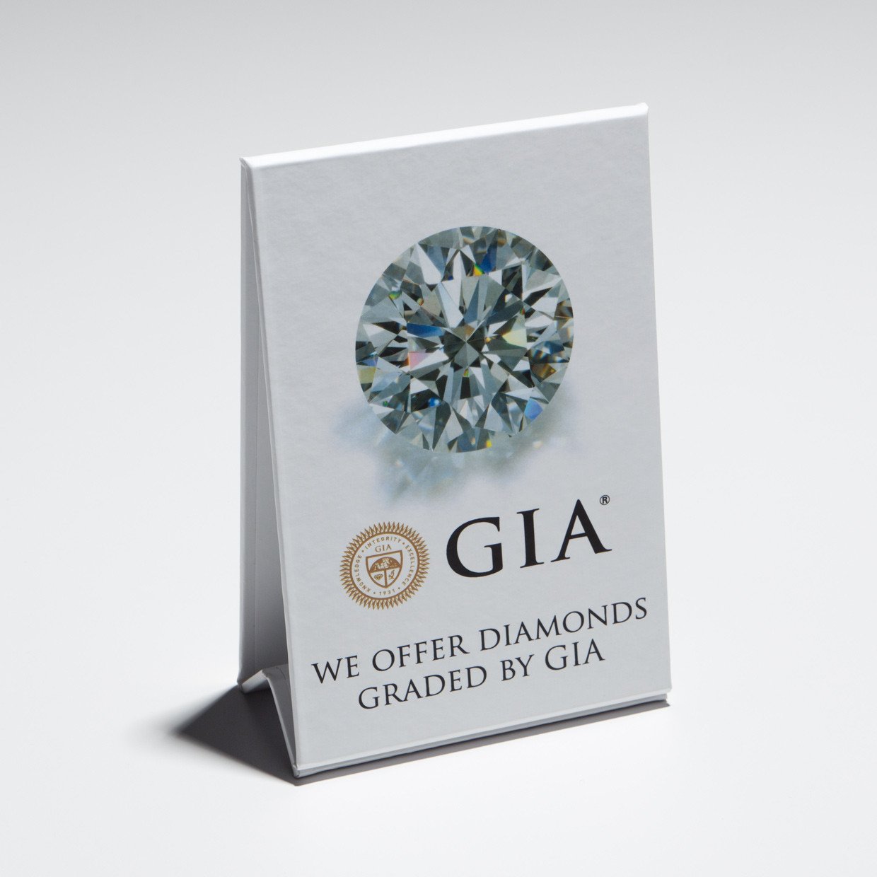 • Stand-up white cardboard display with diamond, logo, and text "We Offer Diamonds Graded by GIA"